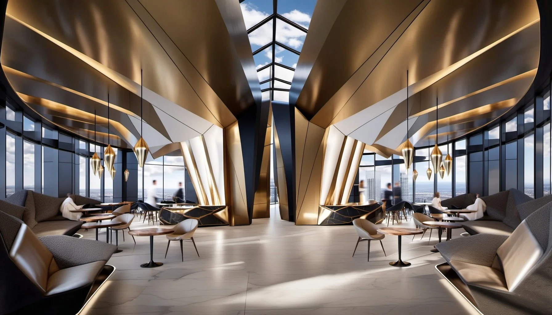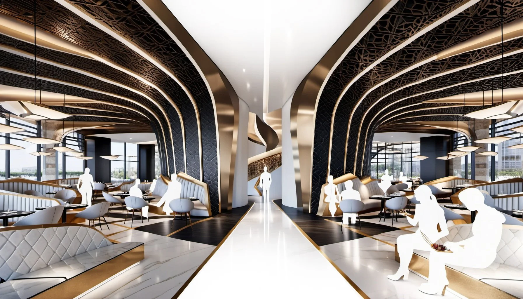Located at the top of the 100m tower, the Sky Bar offers a stunning 360° view of the surroundings. The space is characterized by futuristic aesthetics, with metal folding wings enveloping the ceiling and walls. The central focus is the circulation area and bar counter, creating a dynamic and cutting-edge atmosphere.