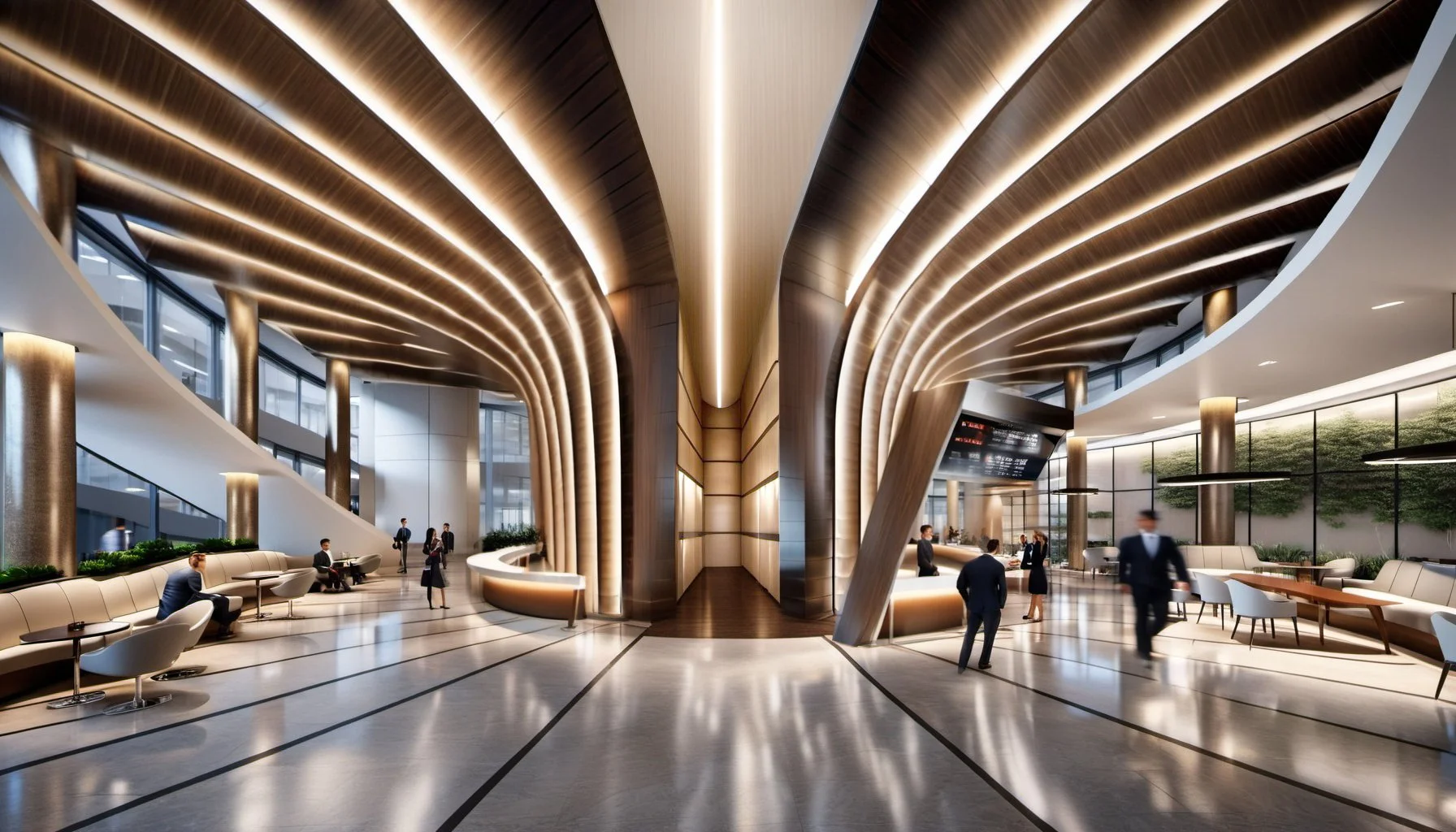 The lobby is a spacious and inviting area designed to inspire excellence. On the left, there is an information and waiting area, while the right side features a café for relaxation and coffee breaks. The overall design aims to create a welcoming and uplifting atmosphere.